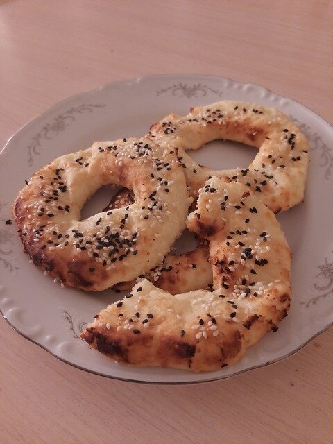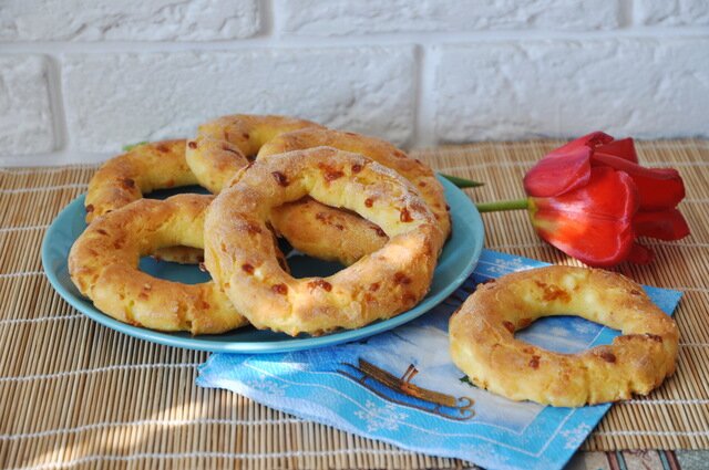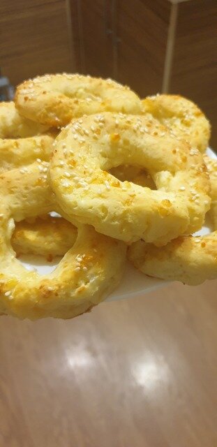 Из каждой части теста сформируйте бублик, выложите на противень (я катала прямо на противне ), посыпьте кунжутом. И ставим в духовку при температуре 180 градусов на 20 минут до золотистой корочки.