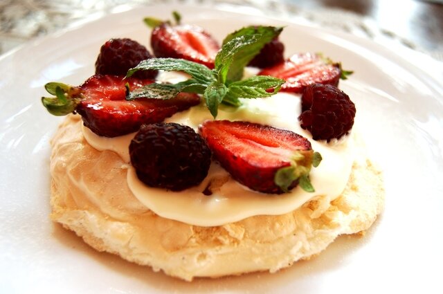 Этот воздушный и нежный десерт, посвященный знаменитой балерине Анне Павловой, был изобретен в Австралии или Новой Зеландии. Жители этих двух стран до сих пор не могут решить - кто же из них был первым :) А еще - это любимый торт моего мужа. Первый раз я приготовила этот необыкновенный десерт в один солнечный апрельский день в качестве подарка в день рождения моих любимых мальчиков - мужа и сына. Этот торт покорил их с первого взгляда! И неудивительно, невероятная меренга с хрустящей корочкой сверху и зефирообразной структурой внутри, дополненная нежным сливочным кремом и вкусными ягодами. В таком сочетании это просто волшебно! Но при всей своей кажущейся легкости, этот тортик не такой уж и простой. Если вы решитесь его приготовить, будьте готовы к тому, что "Павлова" может и "покапризничать". Я его готовила уже 6 раз и каждый раз что-то дорабатывала в рецепте, потому что не была на 100% довольна результатом. То безе осядет и потрескается, то сливки не взобьются. Долго экспериментировала с температурой: при 100 градусах безе не подсушивается сверху, при 150 - сильно пересушенное и темно-кремового цвета. Сегодня я предлагаю вам тот вариант, при котором торт получился почти идеальным, но он настолько всем нравится, что я буду его делать еще не один раз, стремясь к совершенству :)