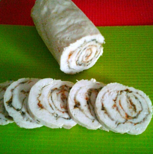 Присыпать крахмалом филе. Крахмал задерживает жидкость и таким образом рулет получится сочным. Желатин в данном деле не поможет, так как мясо выпустит сок, смешается с желатином и в результате получится рулет в толстой оболочке холодца. Разложить филе друг на друга, так чтобы края соприкасались и завернуть рулет.