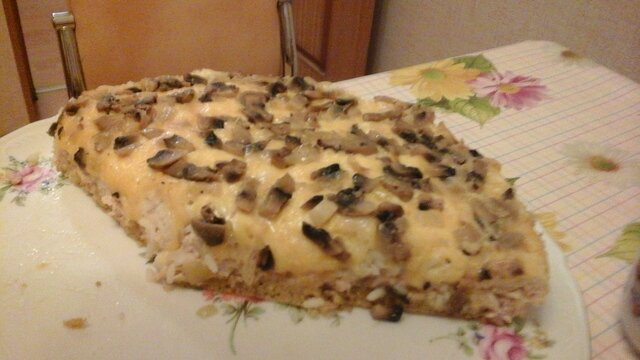Сытный слоёный пирог с шампиньонами, сыром, рисом и фаршем.