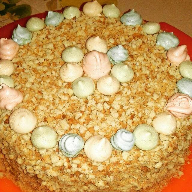 От себя я к этому рецепту добавила для декора меренги, бабушка же торт просто обсыпает приготовленной крошкой из обрезков коржа (если будут) или песочного печенья. Ну, об этом подробнее расскажу далее, по ходу приготовления!