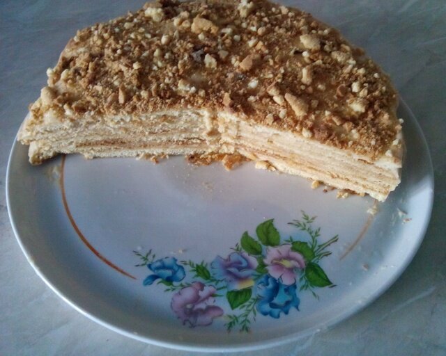 Количество ингредиентов я уменьшила вдвое. Бабушкин торт мы всегда ели несколько дней, он получался огромный. Я же предлагаю тортик стандартного размера, из 6-7 коржей.