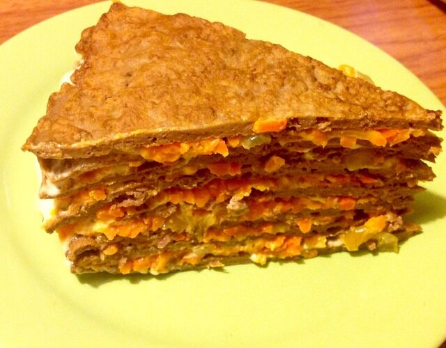 Вкусная, необычная закуска к празднику, или семейному ужину готова! Режем как торт и раскладываем лопаткой на тарелки любопытствующих и проголодавшихся! Приятного аппетита!