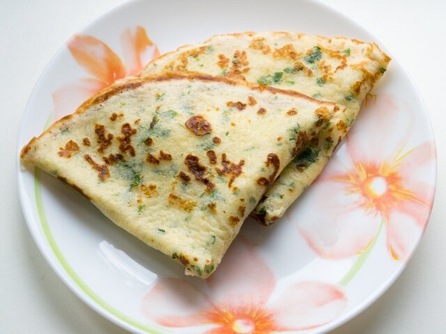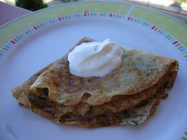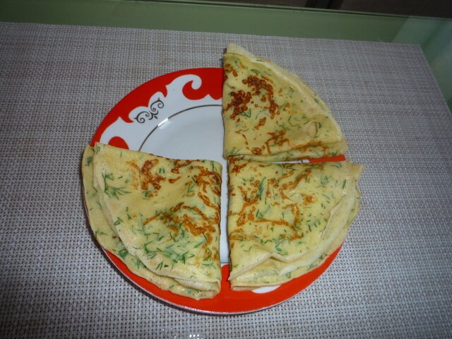 Блинчики готовятся также, как и обычные. Только в тесто добавляется тертый сыр и зелень. Можно кушать со сметанкой, а можно - с красной икрой, запивая горячим чаем или теплым молоком.