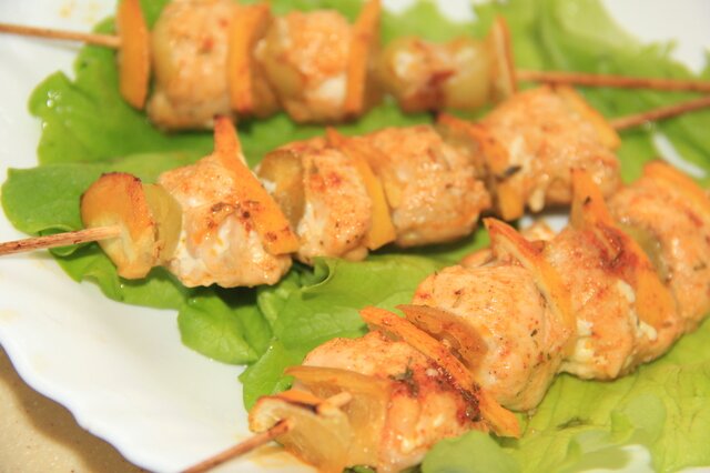 Готовые шашлычки сразу же подаем к столу. И да! Кабачок будет похрустывать, но это не означает, что он сырой (хотя их и сырыми тоже можно кушать). На гарнир хорошо подойдет рис, но и с картошечкой будет отлично. Приятного аппетита!