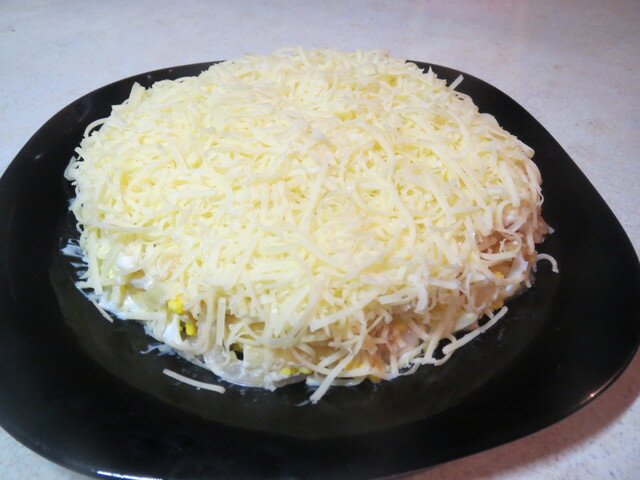 Потом насыпаем порезанные два яйца и снова смазываем слой майонезом;