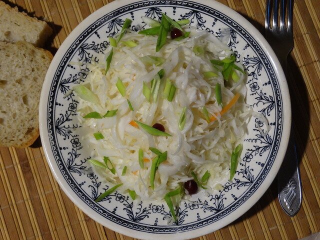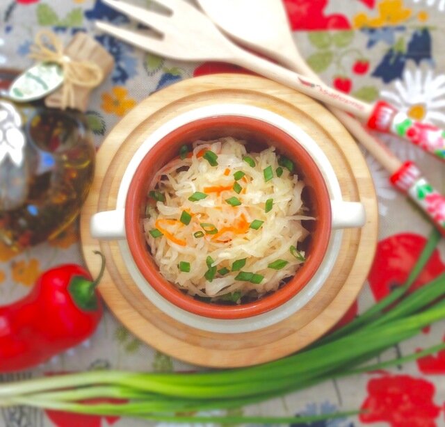 А теперь можно и похрустеть, посыпав капустку сахарком, сдобрив ароматным маслицем холодного отжима и присыпав зеленым или репчатым лучком!!! Вкусная, хрустящая, полезная закуска готова! И не только закуска, так как капуста хороша и в первом блюде - щах и во втором - классическом бигусе, и в салате - в том же винегрете! Приятного аппетита!