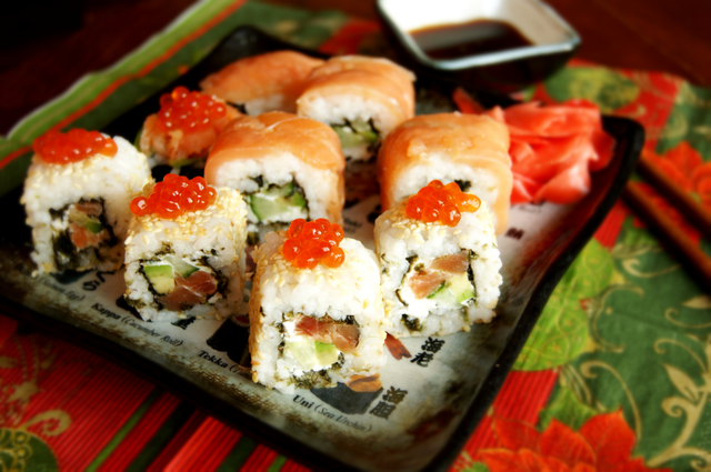 Нарезать роллы, уложить на блюдо, подавать с маринованным имбирем, соевым соусом, по желанию с красной или черной икрой. И не забудьте в соевый соус добавить ложку маринада от имбиря, он сбалансирует соленный вкус соуса.