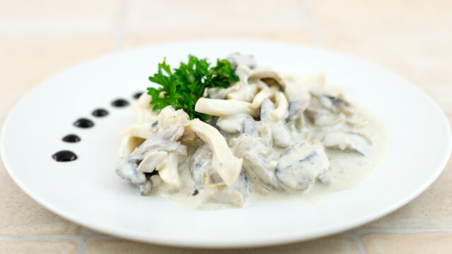 Из данного количества ингредиентов получается 4 порции. Кальмары у меня были свежезамороженные, поэтому, предварительно разморозив, я обдала их кипятком, очистила и опустила на 3 минуты в кипящую воду. Для экономии времени, шампиньоны можно взять консервированные, уже резанные из банки. При отсутствии сливок - взять жирное молоко.