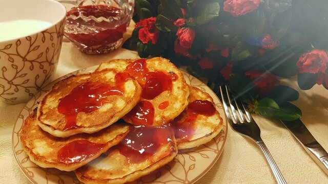 Подаем оладьи теплыми со сметаной, вареньем, сгущенкой или просто посыпав сахарной пудрой. Приятного аппетита!