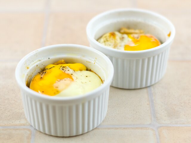 Делаем небольшие лунки, разбиваем туда яйцо. Ставим в разогретую духовку до 180 градусов на 12-15 минут.