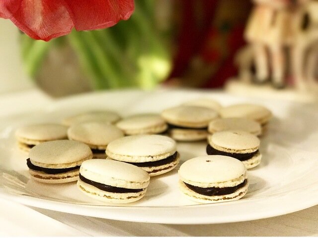 Наверняка многие видели Макаронс всех цветов радуги и с разнообразными начинками. Я же приготовила классический вариант, без красителей, прослоив шоколадным ганашем (густого джема или крема у меня попросту не было, да и дети любят больше шоколад).