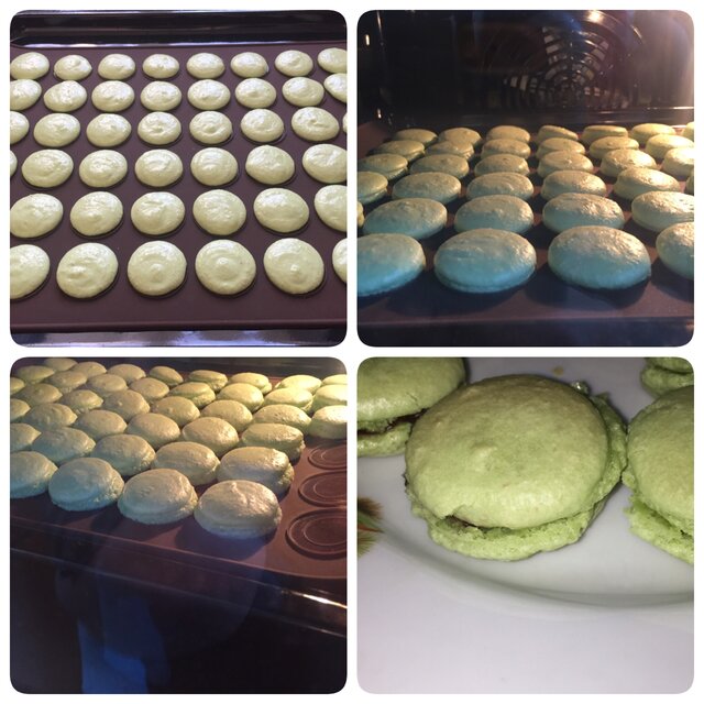 Выкладываем макаронаж в кондитерский мешок без насадки. Закручиваем мешок с широкой стороны. На противень (может понадобиться еще один, у меня несколько пирожных не поместились), покрытый пергаментом начинаем отсаживать будущие пирожные. Делать нужно так: держать кулинарный мешок строго вертикально над бумагой, выдавливать тесто (помните, что оно еще растечется) прямо в центр воображаемого или нарисованного кружка (не забываем оставлять между ними расстояние), а в конце резким, но аккуратным движением убирать носик мешка вбок. Если горбики торчат, подложить под противень полотенце и легонько постучать об стол.