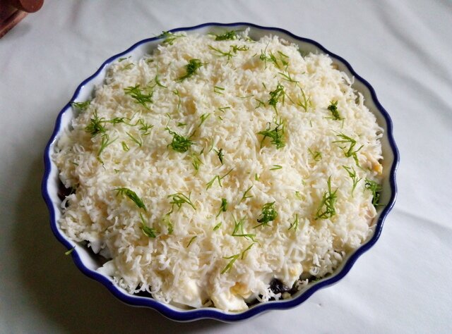 Нашла в кулинарной записной книжке ещё один салат, который я отправила на пенсию. А ведь раньше его готовили на семейные торжества. Салат с интересным вкусом, в салате присутствует чернослив, который даёт лёгкую кислинку.